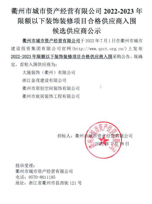衢州市城市資產經營有限公司2022-2023年限額以下裝飾裝修項目合格供應商入圍 候選供應商公示