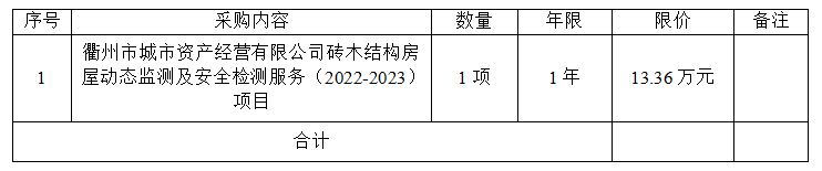 一、項(xiàng)目名稱:衢州市城市資產(chǎn)經(jīng)營有限公司磚木結(jié)構(gòu)房屋動(dòng)態(tài)監(jiān)測(cè)及安全檢測(cè)服務(wù)(2022-2023)項(xiàng)目