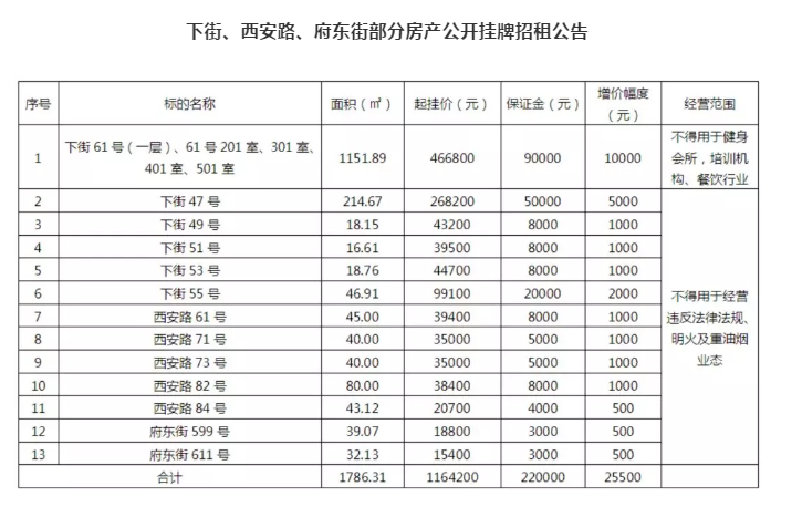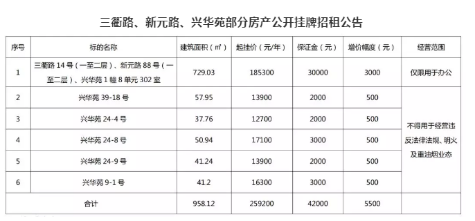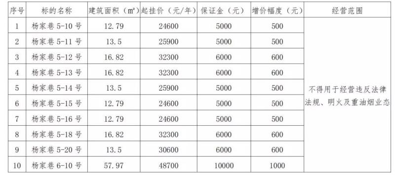 2、所有標(biāo)的的租期均為五年,首年租金按成交價,從第二年起在上一年租金的基礎(chǔ)上遞增3%。