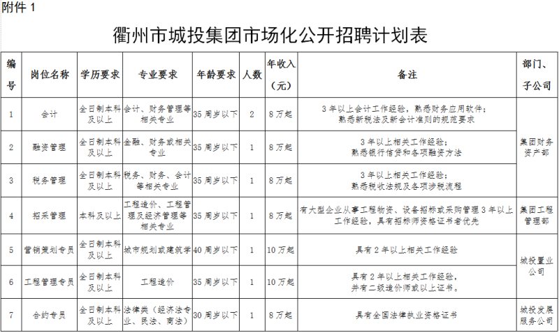 一、招聘原則堅(jiān)持“公開、公平、公正、擇優(yōu)”的原則。二、招聘計(jì)劃本次面向社會(huì)公開招聘衢州市城市建設(shè)投資集團(tuán)有限公司及下屬子公司國有企業(yè)工作人員共23人。具體招聘崗位、崗位(專業(yè))人數(shù)及其他條件要求詳見附表1。三、招聘條件報(bào)名者除應(yīng)符合所選聘職位的具體要求外,還應(yīng)具備以下基本條件:1.擁護(hù)中華人民共和國憲法,具有良好的思想政治素質(zhì)和保密意識(shí)。2.熱愛工作,遵紀(jì)守法,誠實(shí)守信、品行端正。3.有事業(yè)心和責(zé)任感,良好的學(xué)習(xí)能力、分析能力。4.具有勝任應(yīng)聘崗位需要的相關(guān)專業(yè)知識(shí)和工作能力,符合應(yīng)聘崗位要求的其它具體資格和條件,其中35周歲以下指1984年10月1日以后出生,其他年齡依此類推。5.身體健康,適應(yīng)崗位要求的身體條件。6.曾因犯罪受過刑事處罰的人員,曾被開除公職的人員,在公務(wù)員招考(事業(yè)單位招聘)考試中被認(rèn)定實(shí)施了考試作弊、弄虛作假行為且仍在不得報(bào)考期限內(nèi)的人員,以及具有法律規(guī)定不得錄用為公務(wù)員的其他情形的人員,不得報(bào)考。7.應(yīng)聘人員不得報(bào)考與招聘單位有公務(wù)員法第六十八條所列回避情形的崗位。8.本次招聘所涉及的工作經(jīng)驗(yàn)計(jì)算統(tǒng)一截止到2020年10月1日。在校就讀期間參加社會(huì)實(shí)踐、實(shí)習(xí)、兼職等不能計(jì)算為工作經(jīng)歷。9.全日制碩士研究生及以上學(xué)歷應(yīng)聘人員報(bào)考崗位專業(yè)不限,可適當(dāng)放寬條件。四、招聘程序和錄用辦法按照公開報(bào)名、資格審查、筆試、面試、體檢和考察、公示、聘用程序進(jìn)行招聘。(一)報(bào)名1.報(bào)名方式:現(xiàn)場報(bào)名。2.報(bào)名時(shí)間:2020年10月21日—2020年11月3日(節(jié)假日除外,上午8:30-12:00,下午14:00-17:00)。3.報(bào)名地點(diǎn):衢州市柯城區(qū)世紀(jì)大道711號(hào)(衢州市人力資源服務(wù)產(chǎn)業(yè)園一樓)。4.聯(lián)系方式:0570-3851819(程女士)、0570-3851069(徐女士)。5.注意事項(xiàng):應(yīng)聘人員請(qǐng)佩戴口罩前往報(bào)名處,每人限報(bào)1個(gè)崗位,多報(bào)無效。應(yīng)聘人員必須對(duì)提交材料的真實(shí)性負(fù)責(zé),凡弄虛作假者,一經(jīng)查實(shí),即取消考試資格或聘用資格。應(yīng)聘人員需攜帶本人有效身份證件、學(xué)歷(學(xué)位)證書(附學(xué)信網(wǎng)上的教育部學(xué)歷證書電子注冊(cè)備案表,留學(xué)人員應(yīng)提供教育部留學(xué)服務(wù)中心出具的國外學(xué)歷學(xué)位認(rèn)證書)、工作證明(附社保單位公章的歷年社保繳費(fèi)證明)、報(bào)考崗位所需的職稱證書、職業(yè)資格證書及其它相關(guān)證書原件及復(fù)印件,近期免冠1寸彩色照片1張,到現(xiàn)場報(bào)名統(tǒng)一填寫《報(bào)名登記表》。(二)資格審查報(bào)名時(shí)間截止后,由海納公司根據(jù)應(yīng)聘人員提供的資料進(jìn)行資格審查,城投集團(tuán)審核。(三)考試1.本次招聘原則上按照招聘計(jì)劃數(shù)與資格審查合格人數(shù)1:3比例開考,不足開考比例的按招聘計(jì)劃數(shù)3倍的崗位將酌情核減,核減情況通過相關(guān)平臺(tái)面向社會(huì)公布,不做補(bǔ)充報(bào)名工作。2.筆試:由海納公司統(tǒng)一組織筆試,采用閉卷形式,滿分為100分。重點(diǎn)考察專業(yè)理論知識(shí)掌握能力、文化素養(yǎng)、知識(shí)儲(chǔ)備和業(yè)務(wù)基礎(chǔ),不指定復(fù)習(xí)范圍。3.面試:根據(jù)筆試成績,每個(gè)崗位按照招聘崗位計(jì)劃數(shù)按筆試成績從高分1:4的比例從高分到低分確定面試對(duì)象。應(yīng)聘者未在規(guī)定時(shí)間內(nèi)參與面試的,視同自愿放棄面試資格,即不予遞補(bǔ),不足比例的按照實(shí)際入圍人數(shù)確定。面試采用結(jié)構(gòu)化面試方式,滿分為100分,合格分為60分(低于60分為不合格),面試不合格者不予聘用。4. 因疫情原因,具體筆試、面試時(shí)間、地點(diǎn)另行通知。(四)體檢1.面試結(jié)束后,按筆試成績占30%、面試成績占70%的比例折合總成績,保留小數(shù)點(diǎn)后兩位。2.根據(jù)總成績從高分到低分按1:1確定體檢對(duì)象,總成績相同者,以筆試成績高者確定體檢對(duì)象。3.應(yīng)聘人員不按規(guī)定時(shí)間、地點(diǎn)參加體檢,視作放棄體檢,取消考察和聘用資格;若有放棄體檢或體檢不合格的,則按總成績從高到低依次遞補(bǔ)。4.體檢由城投集團(tuán)組織,因疫情原因,時(shí)間、地點(diǎn)另行通知。(五)考察考察工作參照考錄公務(wù)員考察標(biāo)準(zhǔn)執(zhí)行。側(cè)重于考察思想政治表現(xiàn)、道德品質(zhì)、核查檔案資料,是否有不良記錄等情況,并對(duì)應(yīng)聘人員資格條件進(jìn)行復(fù)查(學(xué)歷的認(rèn)證以中國高等教育學(xué)生信息網(wǎng)的信息為準(zhǔn))??疾旖Y(jié)論為不宜聘用的或在考察階段本人自動(dòng)放棄聘用資格的,在面試合格人員中按總成績從高分到低分依次遞補(bǔ)。(六)公示聘用經(jīng)考試、體檢和考察情況擇優(yōu)確定擬聘人員,公示5個(gè)工作日無異議后,按規(guī)定程序辦理聘用手續(xù),與城投集團(tuán)或其子公司簽訂勞動(dòng)合同。五、崗