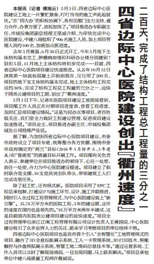 5月11日,衢州日報在頭版重要位置刊登了集團作為業(yè)主單位承建的四省邊際中心醫(yī)院建設進展,對醫(yī)院實行專班制推進、建設模式創(chuàng)新、智慧化工地管理等方面給予高度評價,現(xiàn)予以轉載。