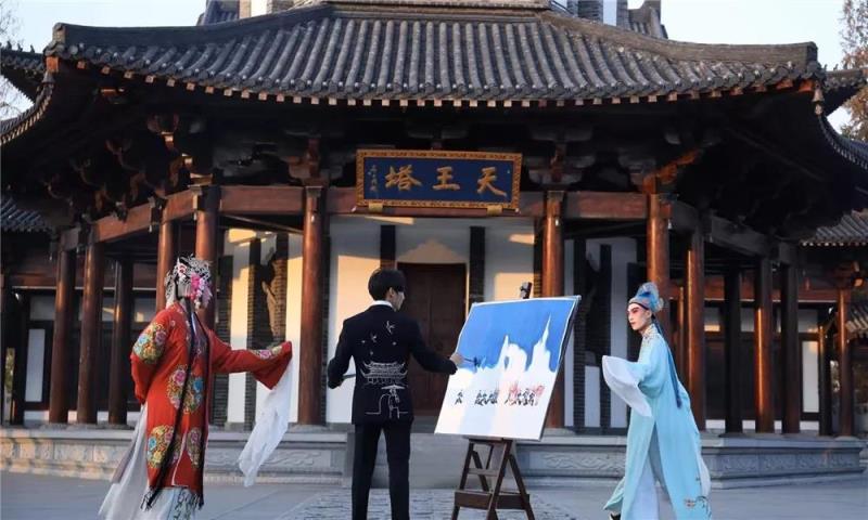 視頻中,何平身著有天王塔元素的西服,并置身在天王塔下邊觀摩婺劇表演者的表演,邊用畫(huà)筆一筆一畫(huà)畫(huà)出婺劇演員最精髓的表情和動(dòng)作,并和澳門(mén)的景色結(jié)合在一起,別有一番韻味。
