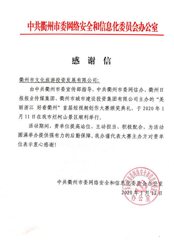 中共衢州市委網(wǎng)絡(luò)安全和信息化委員會辦公室向文旅投公司發(fā)來感謝信