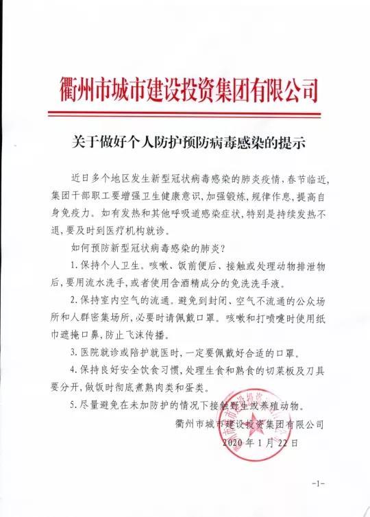 1月22日,市城投集團(tuán)通知要求街區(qū)、景區(qū)、項(xiàng)目工地等做好新型冠狀病毒肺炎疫情防控工作。