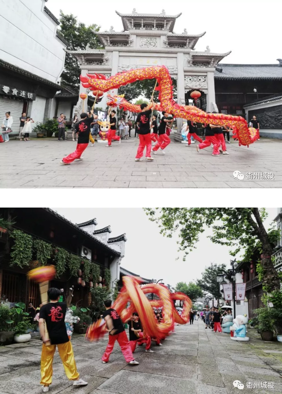 在鼓樂的伴奏下,來自衢州中專龍獅團的舞龍隊在水亭街一會兒俯身游走,一會兒凌空騰躍,靈活地展示著盤、游、騰等舞龍動作,引來觀眾陣陣喝彩。
